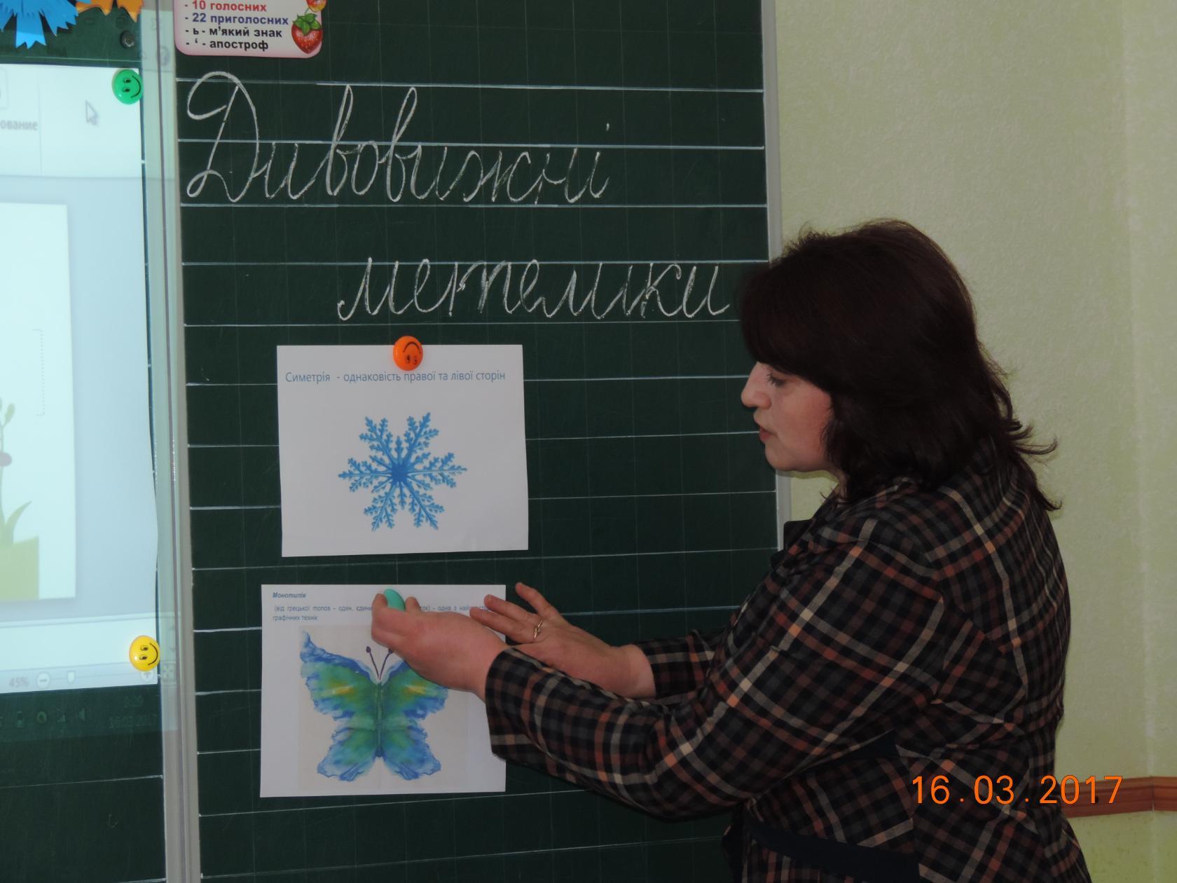 Педагоги Петричанського НВК 16 березня бути присутніми на відкритому уроці образотворчого мистецтва у першому класі. Тема уроку. Симетрія як засіб гармонізації форми. Ознайомлення з технікою монотипії. Створення композиції "Дивовижні метелики". Класовод Піцул Алла Марківна, вчитель вищої категорії, вчила першокласників передавати симетричну форму за допомогою кольору в техніці монотипії, ознайомлювала з роллю осі симетрії у створенні природних форм; розвивала практичні навички роботи живописними матеріалами, зорове сприйняття, фантазію; виховувала в учнів інтерес до творчості, охайність вроботі та дотримання техніки безпеки при користуванні ножицями.